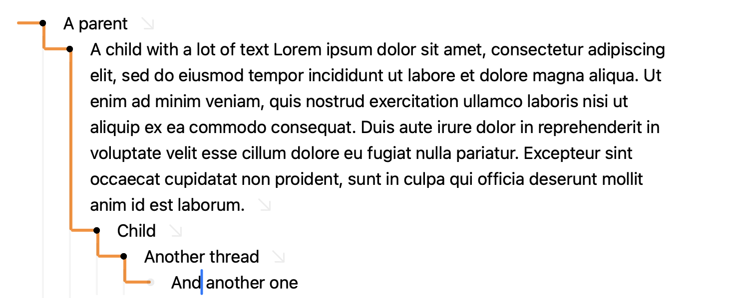 In very long outlines, where you have to scroll to get back up to parent, the thread disappears for some reason. I have no idea why this happens.