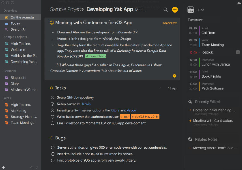 I’m personally a sucker for this with how it hoists navigation to the topmost layer while leaving the bulk of the app, technically in the background of this navigation window, taking up most of the space and thus my attention. I’ll be explicit with hoping alfred’s idea isn’t pursued, but the example below leaves the window layout opt-in. I don’t think I have words to explain why the right sidebar works for me, but its supplemental nature and thus not-always-needing-to-be-present nature would fit Bike (as I am not sure how much I would use a calendar in the app as I’m giving Fantastical another shot).