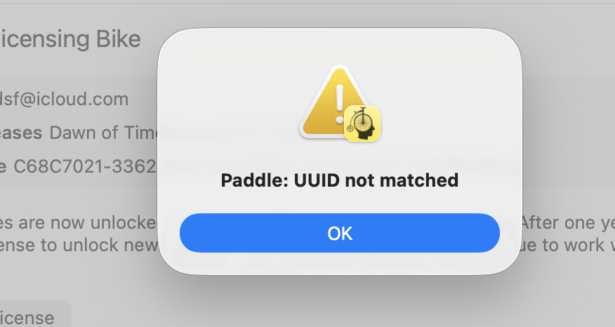 I think it means some aspect of Bike changed such that Paddle is no longer sure it’s the same app that was registered. I’m not sure why this is happening now, but it may be because I recently added Keychain signing capability? I’m not sure.