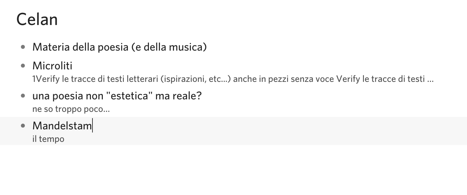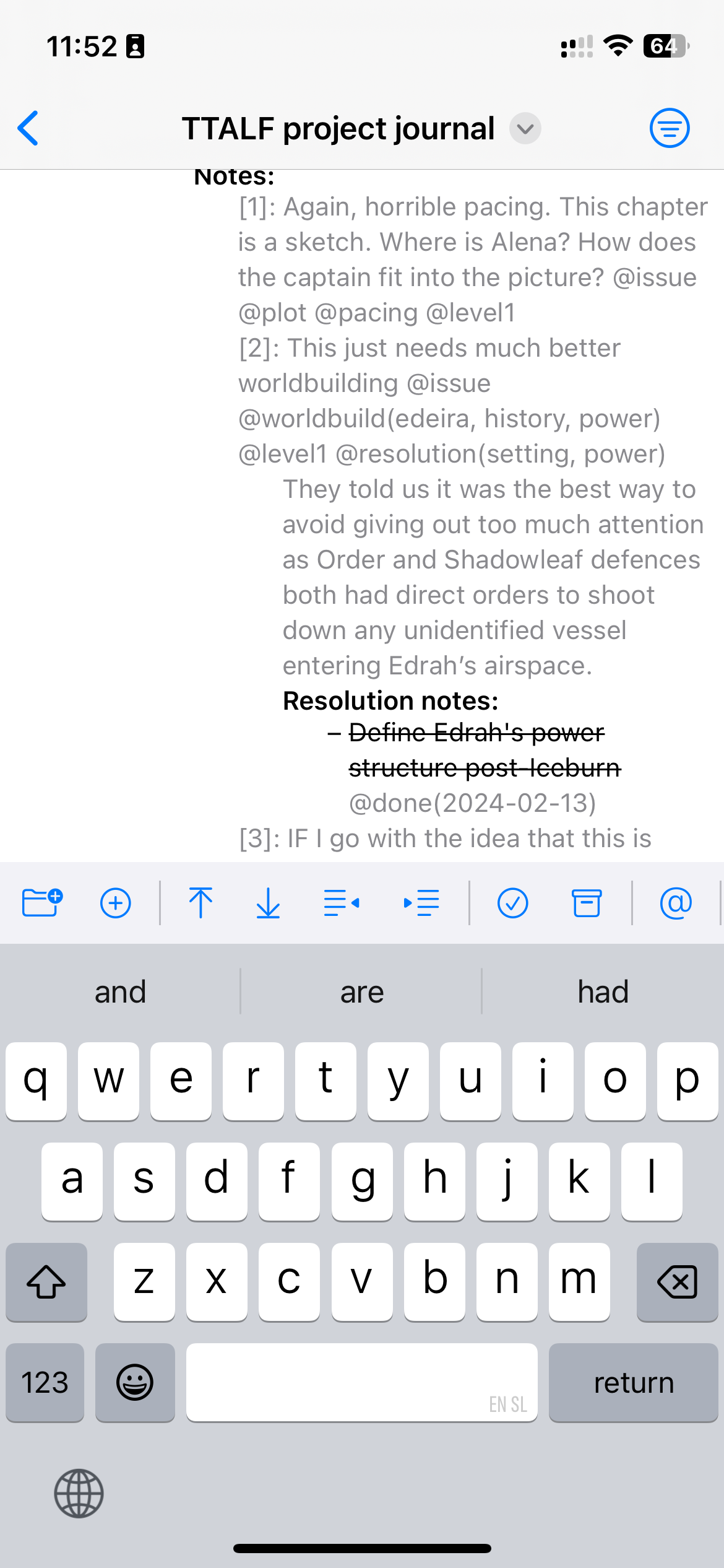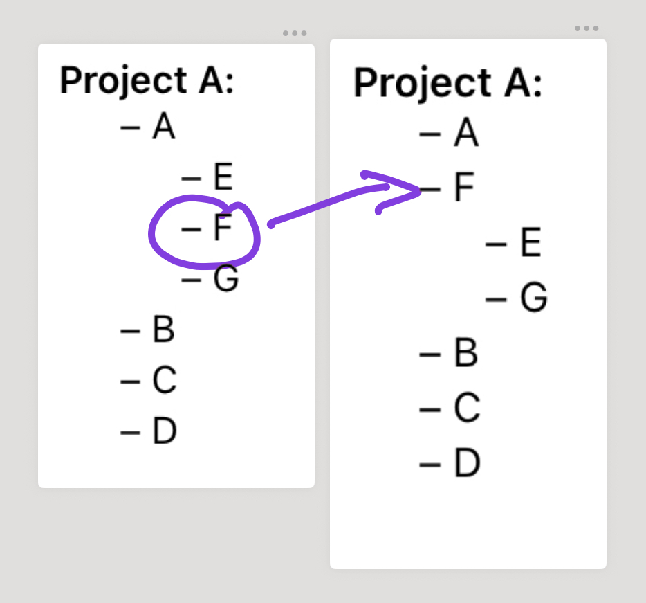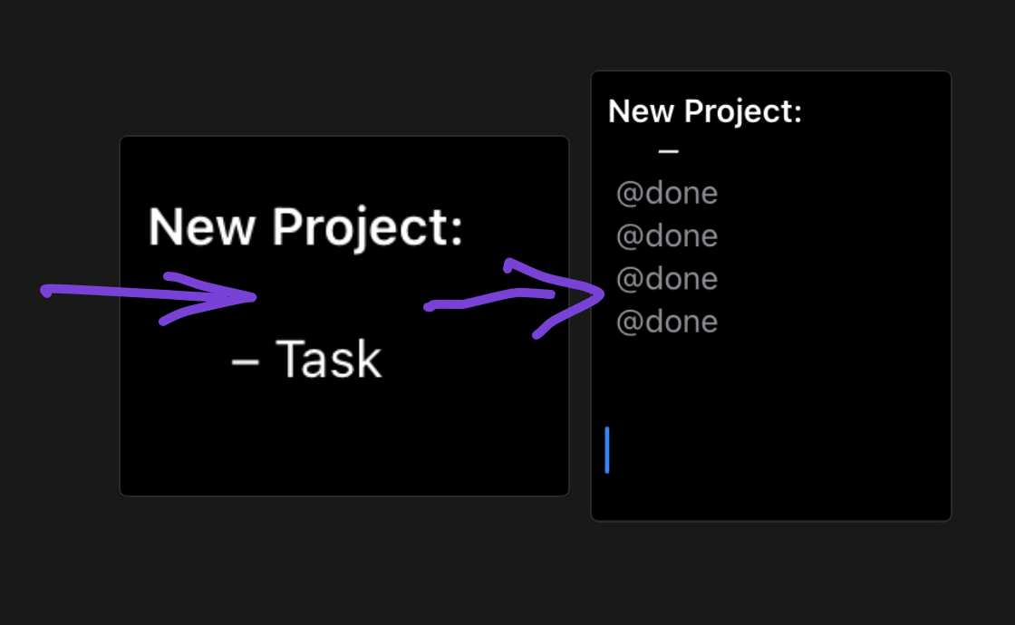 @done status to that line (this one feels like an Easter egg unlock)@done tasks preserves original indentation level in Archive: project; not sure this is useful (seems like a cut-paste operation?). In TaskPaper, items are nested directly under Archive:, but take descendants along with them.I think this is a deliberate choice to make: whether it acts like a text editor or like an outliner—especially after folding is introduced. Personally, I think it makes sense for it to behave exactly like TaskPaper for these movements (e.g. move lines exactly as they are up/down, but also move children when folded).